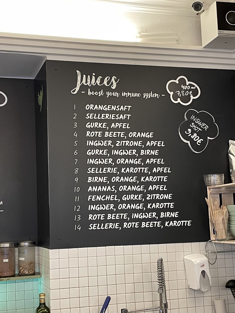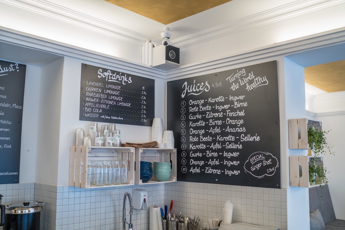 As you step inside, you’ll be greeted by a space that exudes warmth and simplicity. Floor-to-ceiling windows bathe the interior in natural light, creating an inviting atmosphere even on the gloomiest of days. The café is thoughtfully decorated, featuring a blend of modern and cozy design elements that make it an ideal spot for enjoying your favorite brew or settling in with a good book surrounded by a lovely assortment of magazines and the latest German newspapers.